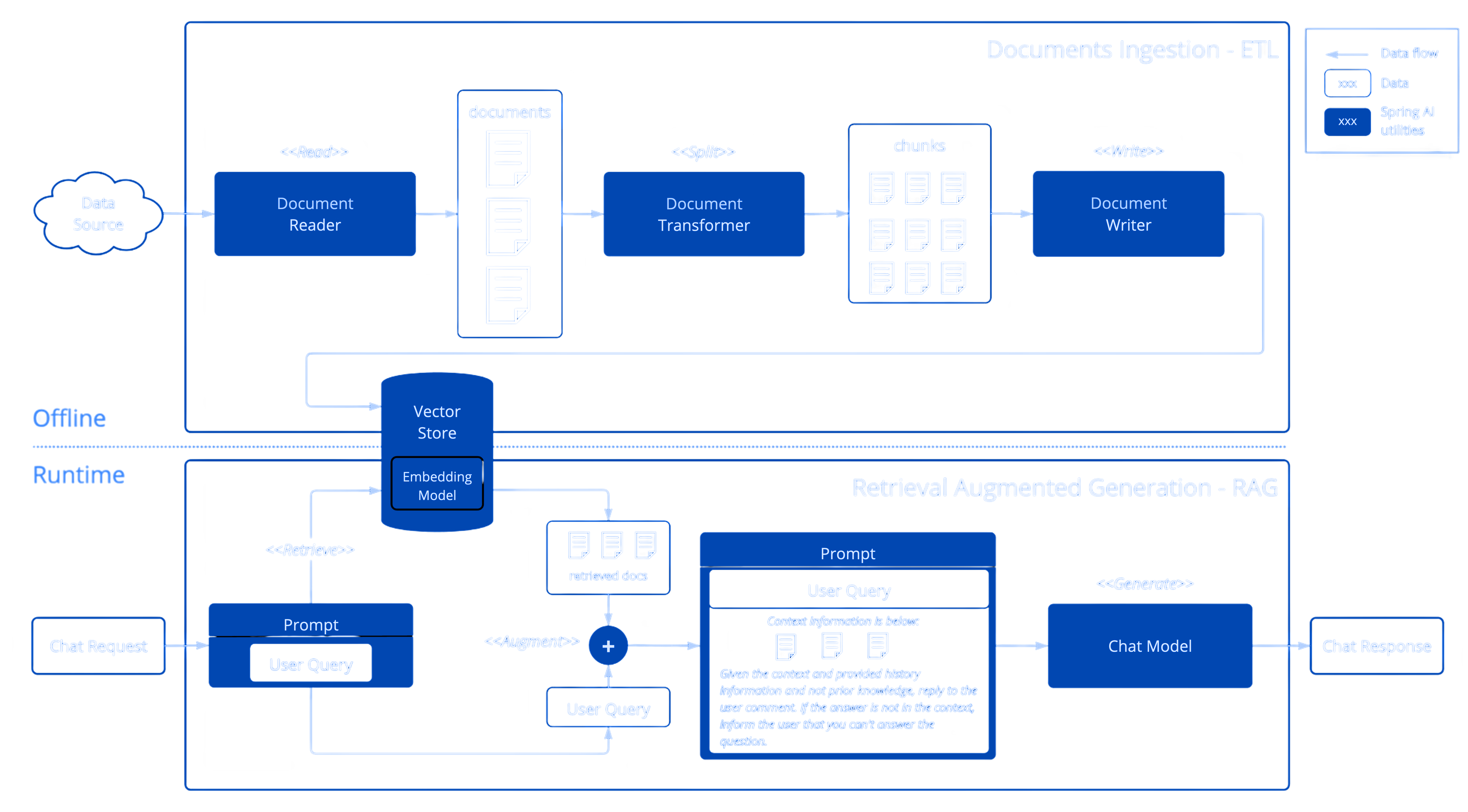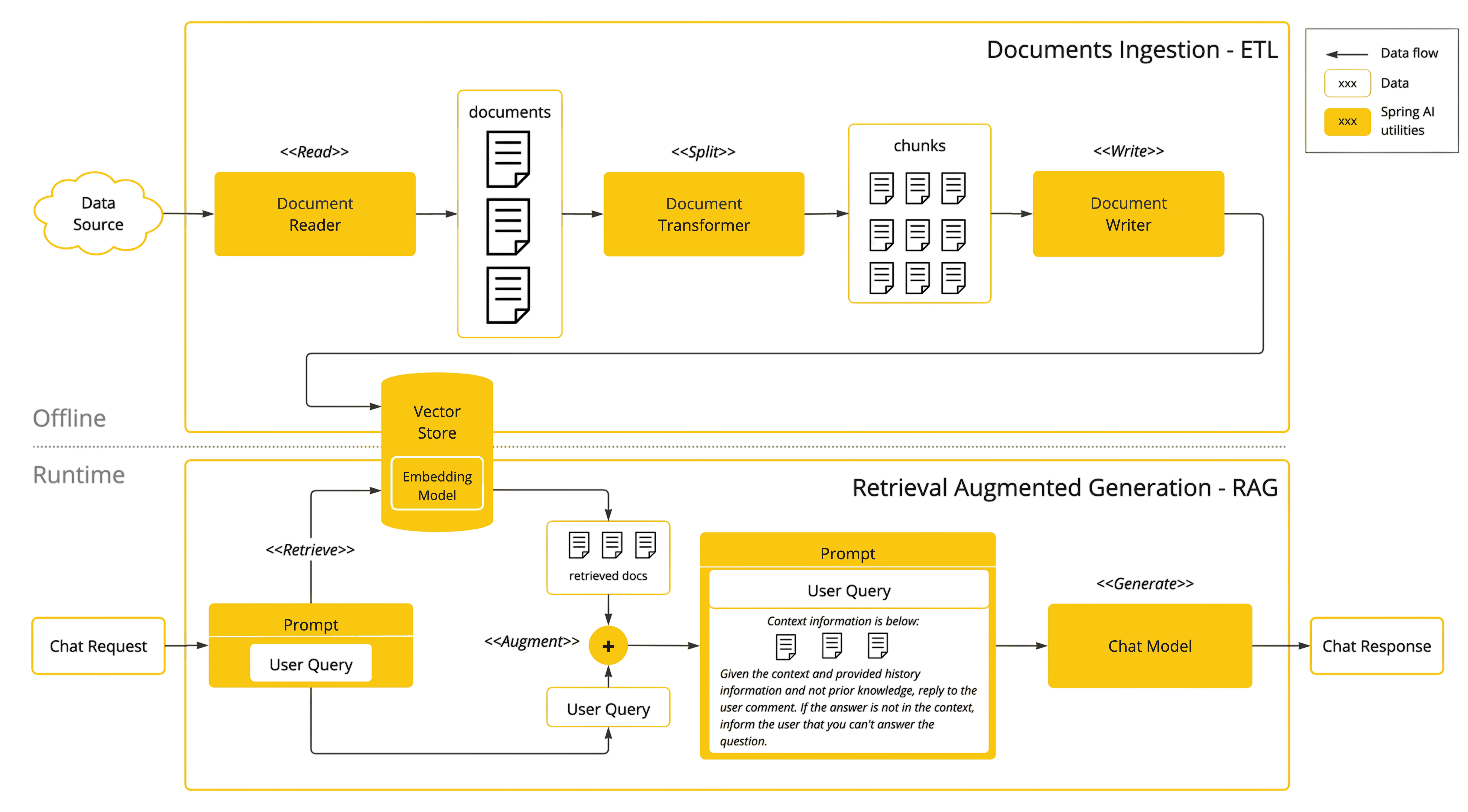 At its core, Spring AI addresses the fundamental challenge of AI integration - Connecting your enterprise Data and APIs with the AI Models. A technique termed Retrieval Augmented Generation (RAG) has emerged to address the challenge of incorporating relevant data into prompts for accurate AI model responses.Spring AI greatly simplifies code you need to write to support RAG pipelines.